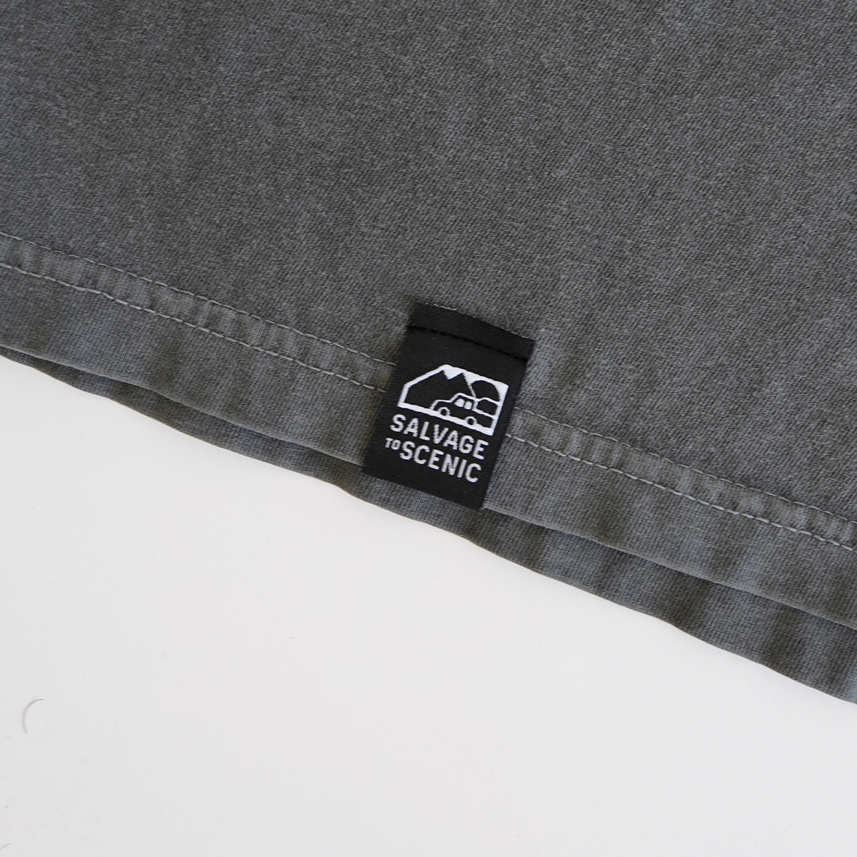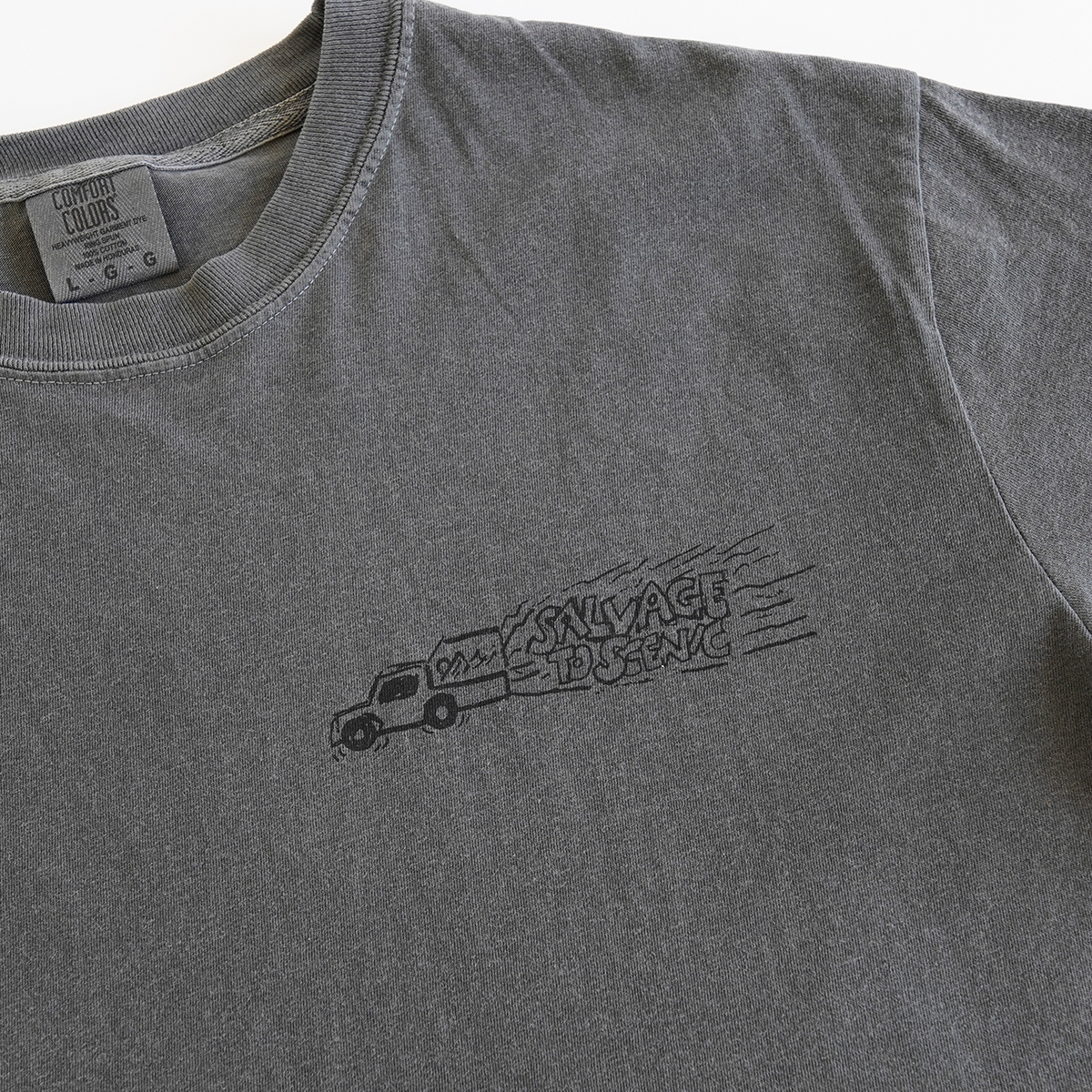 From junkyard dreams to mountain scenes. This tee is built for the road-worn and the reborn—with a hand-drawn scrapyard truck graphic cruising across the front and bold “Salvage to Scenic” lettering stamped on the back.